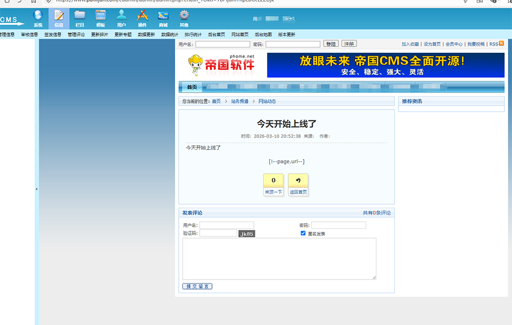 帝国8发布信息点击提交后直接显示前台信息页面了 正常应该是发布成功的提示,然后返回到新的发布页面。 现在直接显示前台信息页面了(前台页面用的是静态模式,但是返回到后台信息列表,点击刚才发布的信息,前台的静态网址也打不开)。 求帮忙给看看指导一下。 【试了一下,栏目和内容页用动态页面的时候,就能正常提交正常信息提示正常再继续到新的发布页面,我查了服务器上的各个目录权限777正常也没啥问题】 当前环境 mysql9.0 php8.4